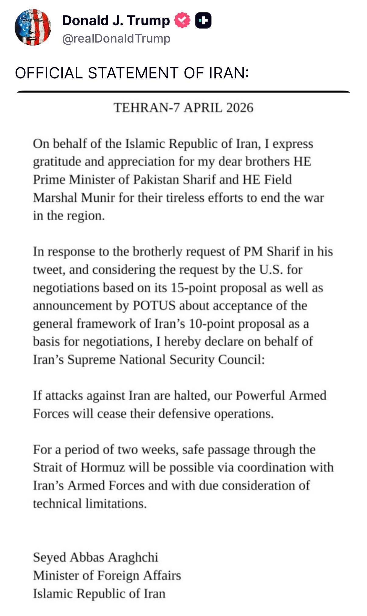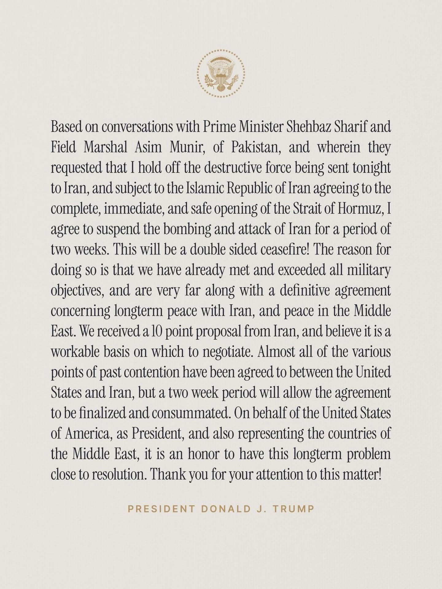 Poco prima, era stato appunto lo stesso Trump a commentare il cessate il fuoco, mantenendosi al solito sopra le righe. “Abbiamo siglato questa tregua di due settimane perché abbiamo raggiunto ed ecceduto i nostri obiettivi militari, e siamo a buon punto per il raggiungimento di una pace con l’Iran e in tutto il medioriente”, si legge nella dichiarazione del Potus, che conclude citando i dieci punti proposti dall’Iran come base su cui lavorare.