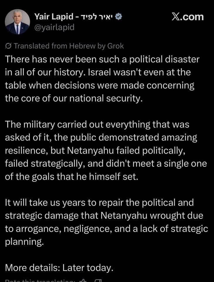 Proprio da Israele - che ricordiamolo, solo ieri mattina ha bombardato con gli Usa una sinagoga Rafi-Nia a Teheran, distruggendola, un fatto cui si è a malapena fatto cenno sui media italiani - arrivano i commenti più stizziti. E non da Netanyahu - che non immaginiamo in ogni caso raggiante - ma dal leader dell’opposizione Yair Lapid.